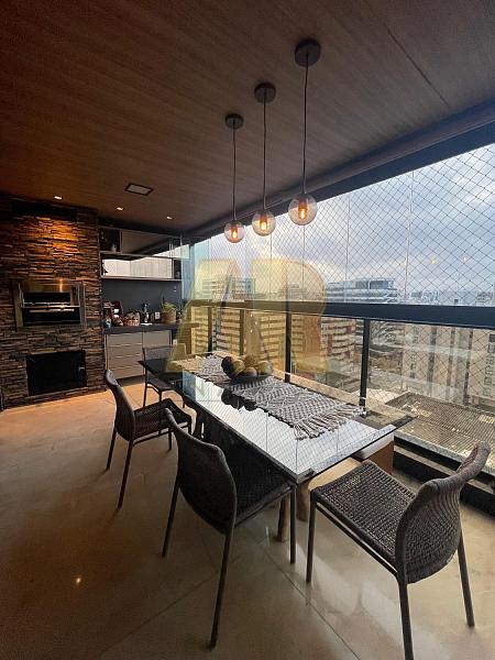 Sala ampla de estar e jantar integrada à varanda gourmet com churrasqueira