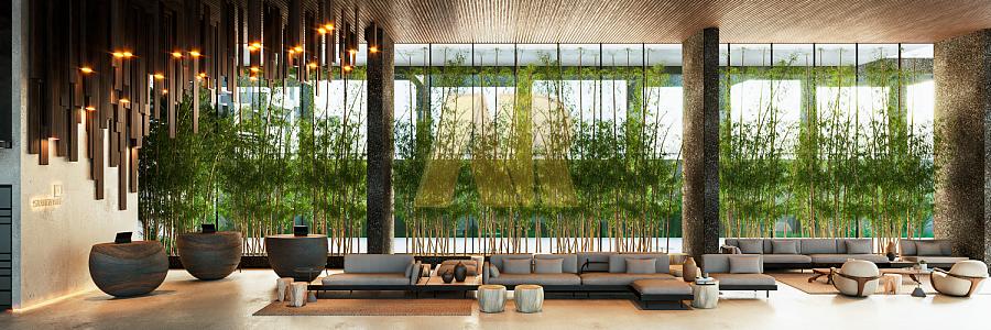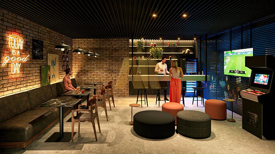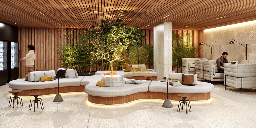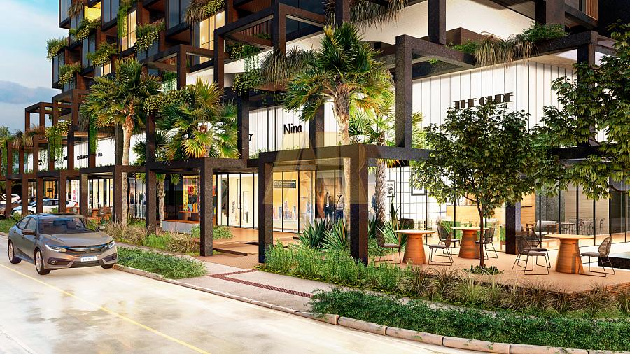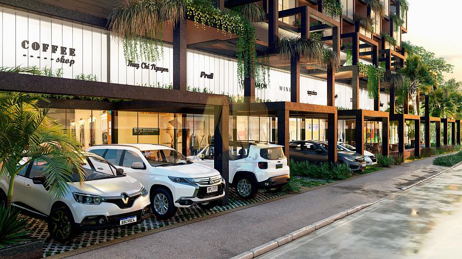 - Recepção e lojas com pé direito duplo;