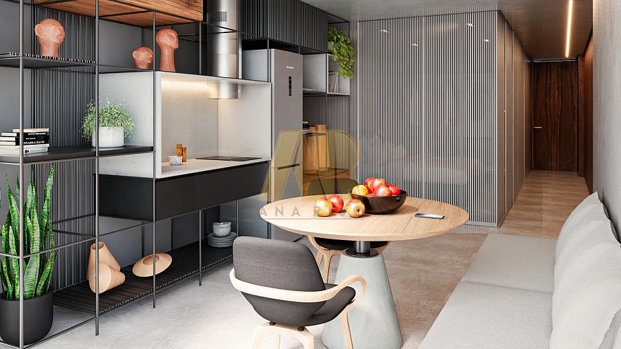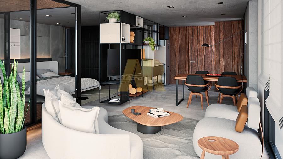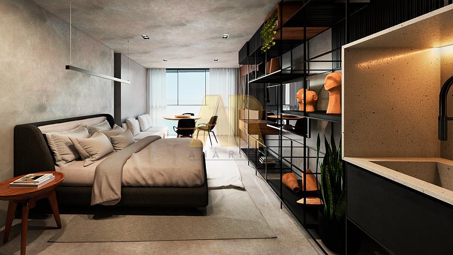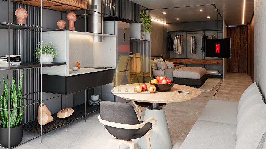 Os apartamentos Studio possuem entre 22 e 52m², com quarto/sala de estar/jantar/cozinha/banheiro integrados, com ou sem jardineira na sacada, e 1 vaga de garagem.